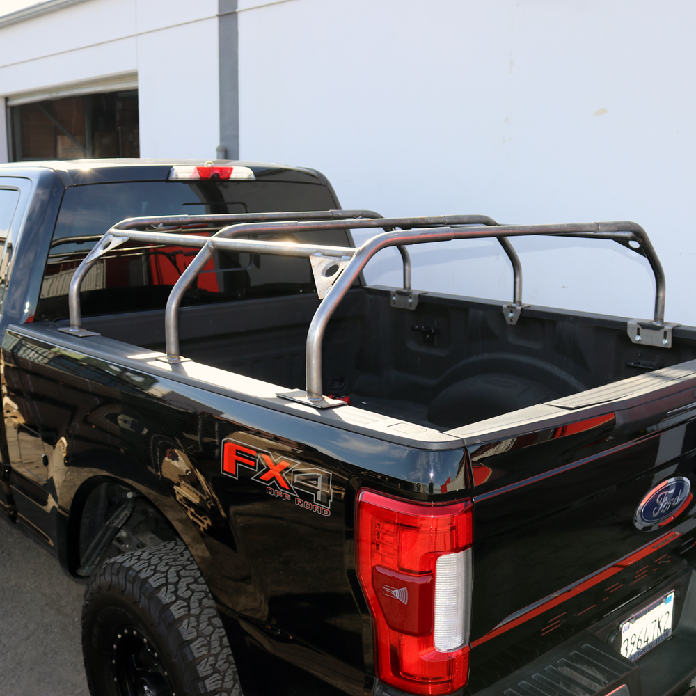 Our rack uses a unique sliding center rail system which allows the rack to be installed on various widths of beds from full-size Ford F350s to mid-size Toyota Tacoma's.
