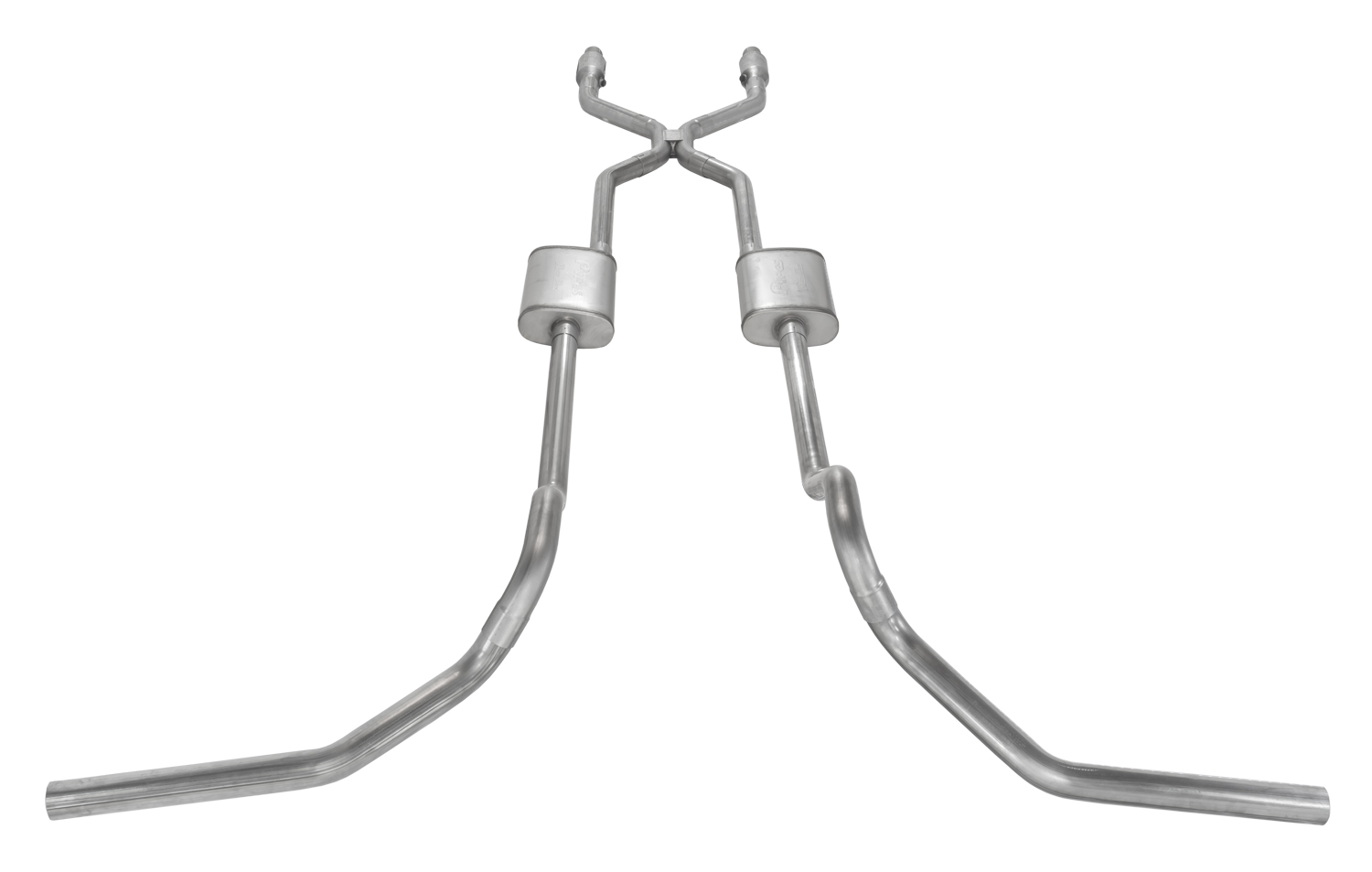Crossmember Back w/H-Pipe Exhaust System 75-87 GM Split Rear Dual Exit 2.5 in Intermediate And Tail Pipe Muffler And Tip Not Incl Natural Finish 409 Stainless Steel Catalytic Converter Incl Pypes Exhaust