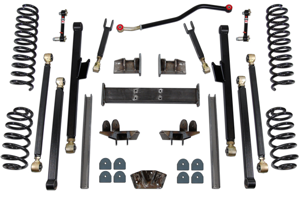 Kit includes, a front 3 piece cross member, unibody rails, rear frame brackets, rear 4 link plate, all 8 adjustable control arms with hardware, front and rear coil springs, front adjustable track bar, front sway bar disconnects, and 8 D shaped spacer plates.