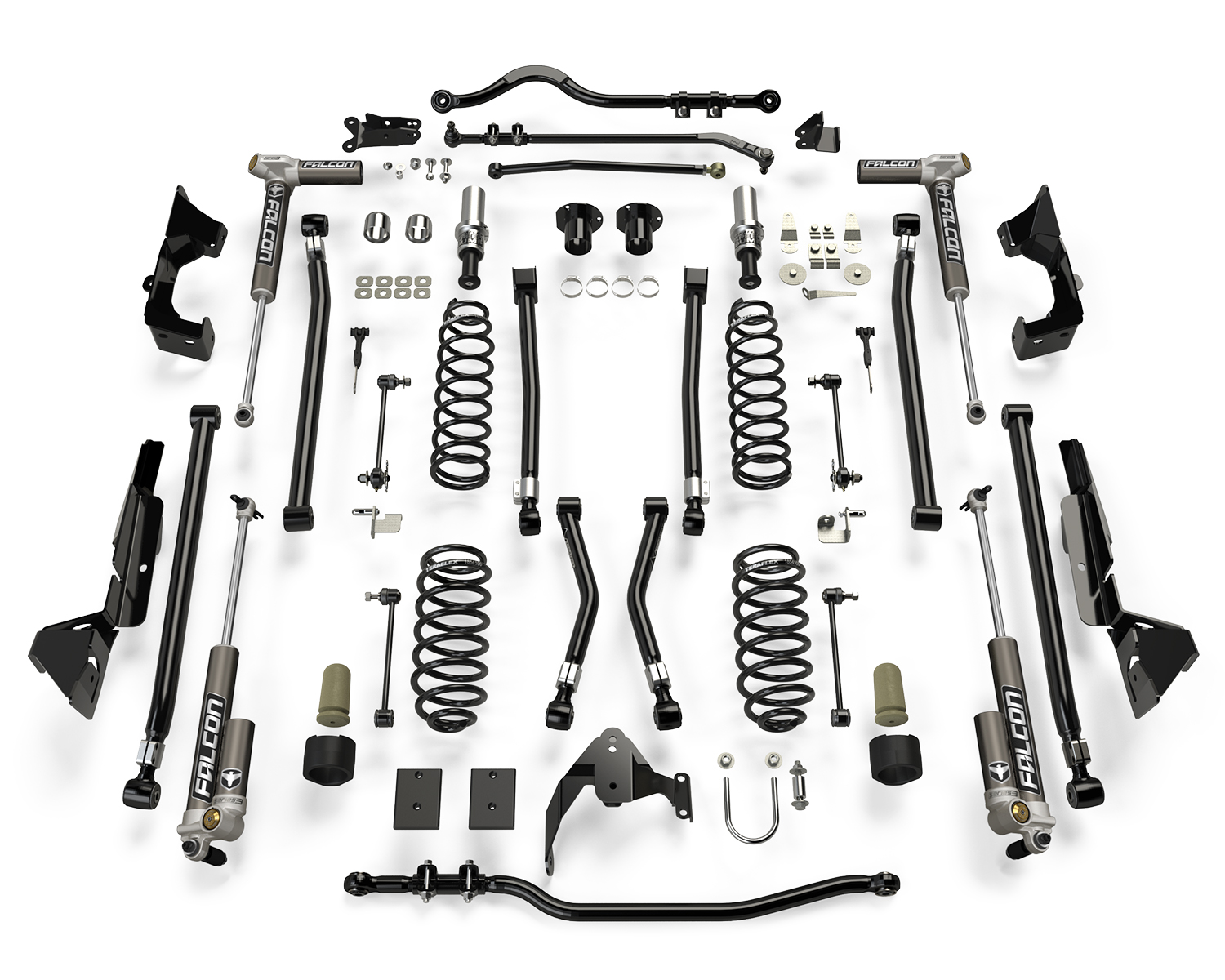 Falcon shocks and TeraFlex coil springs have been designed to work together to improve both compression and rebound for optimal vehicle stability.