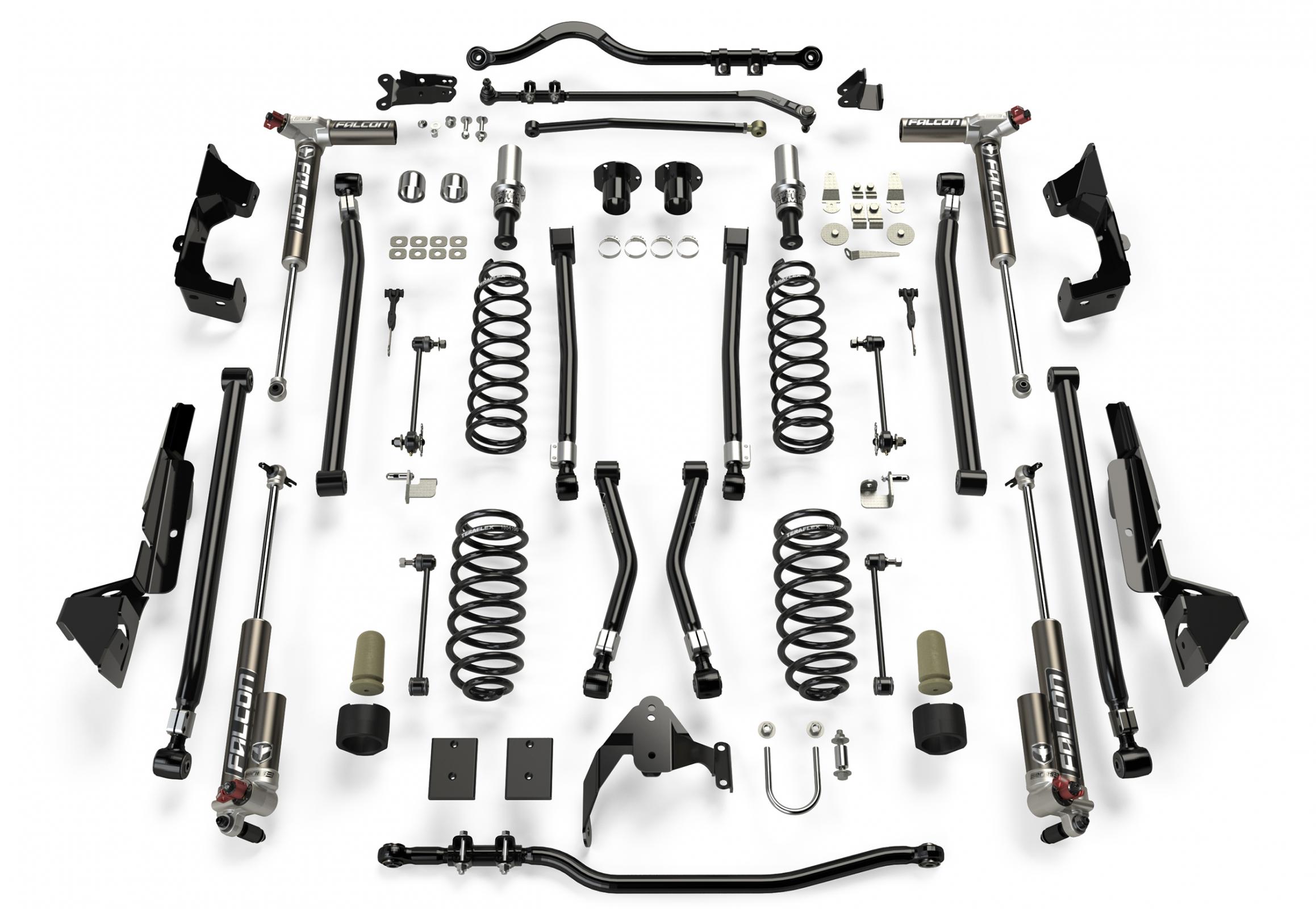 Falcon shocks and TeraFlex coil springs have been designed to work together to improve both compression and rebound for optimal vehicle stability.