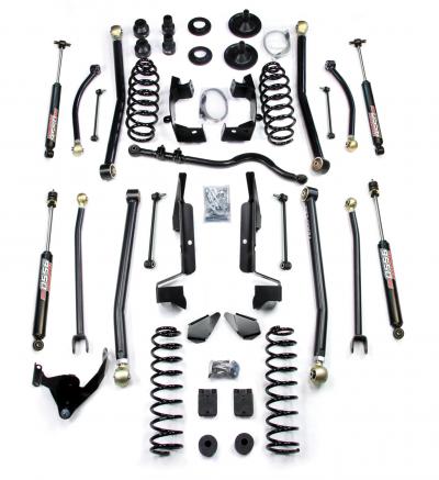 This kit includes 4 inch lift coil springs, 9550 VSS shock absorbers, front adjustable track bar, weld-on long arm bracketry, long adjustable Flexarms, front sway bar disconnects, rear sway bar links, rear track bar bracket, front and rear brake lines and all necessary hardware.