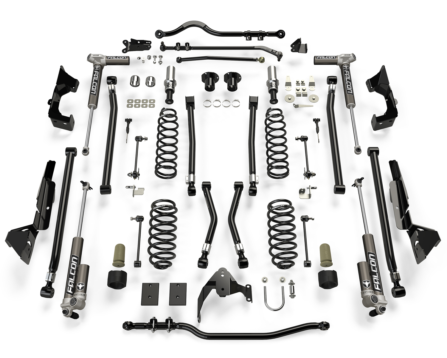 Falcon shocks and TeraFlex coil springs have been designed to work together to improve both compression and rebound for optimal vehicle stability.