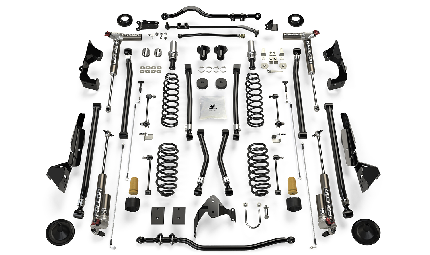 Falcon shocks and TeraFlex coil springs have been designed to work together to improve both compression and rebound for optimal vehicle stability.