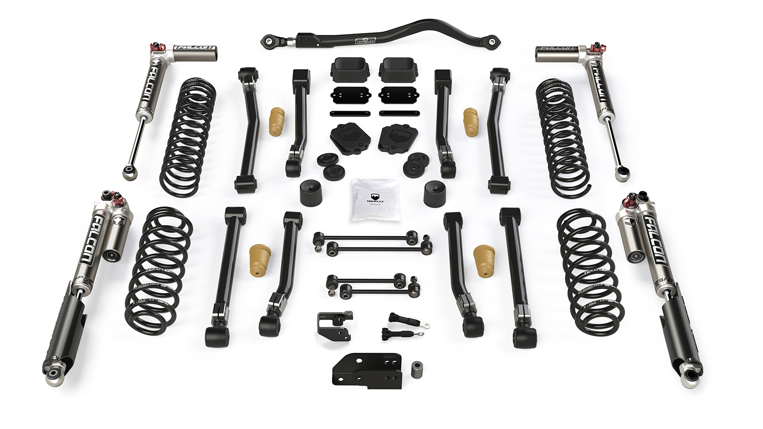 Does not include shocks. We recommend Falcon SP2 Mode Adjust Performance Shocks. Falcon shock absorbers and TeraFlex lift coil springs have been engineered together to improve both compression and rebound for optimal vehicle stability. Alpine CT Suspension Systems are offered with a choice of Falcon SP2 3.3 Fast Adjust Piggyback Shocks, Falcon SP2 3.1 Piggyback Shocks, or without shock absorbers.