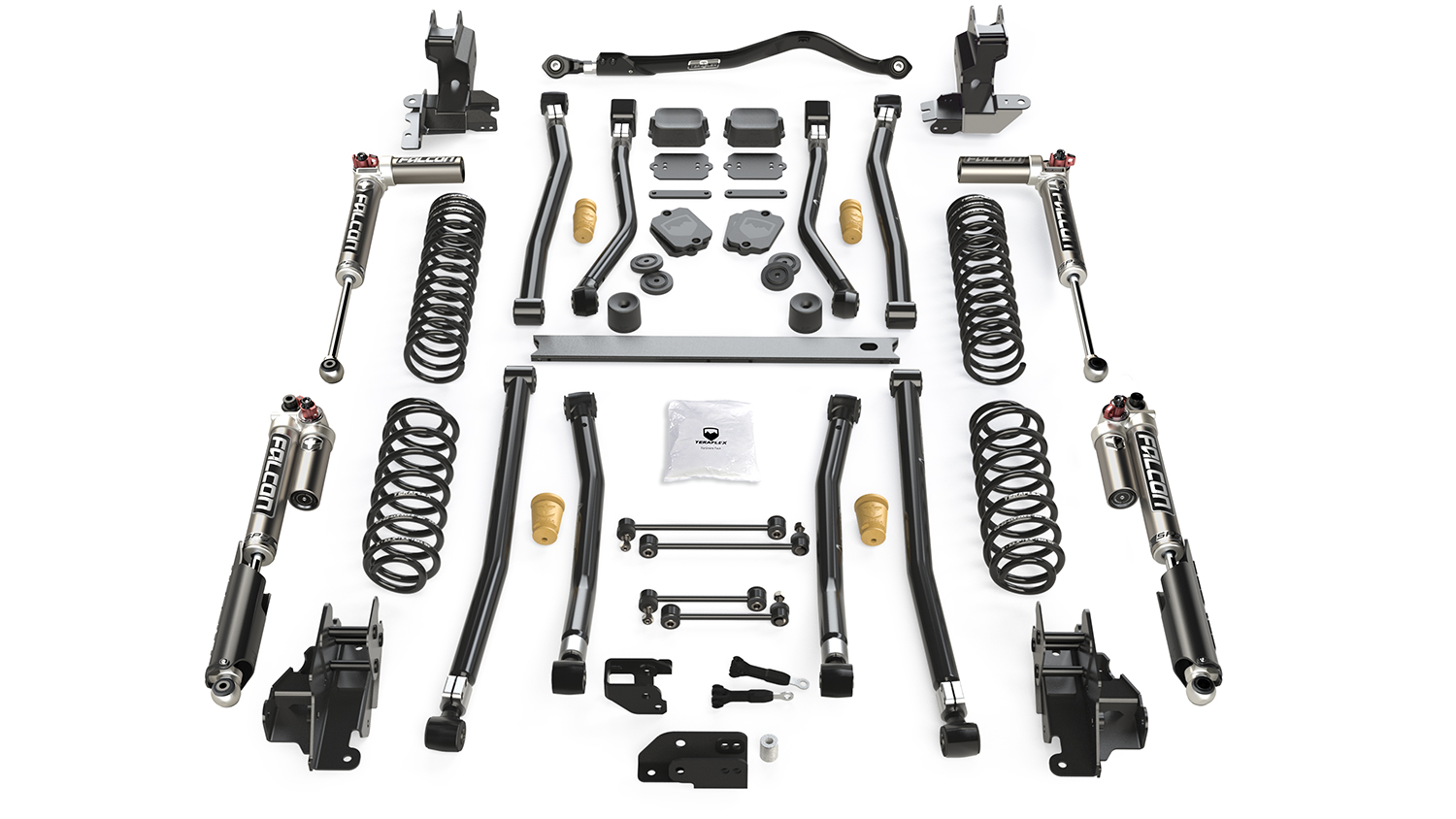 We recommend Falcon SP2 Mode Adjust Performance Shocks. Falcon shock absorbers and TeraFlex lift coil springs have been engineered together to improve both compression and rebound for optimal vehicle stability. Alpine CT Suspension Systems are offered with a choice of Falcon SP2 3.3 Fast Adjust Piggyback Shocks, Falcon SP2 3.1 Piggyback Shocks, or without shock absorbers.