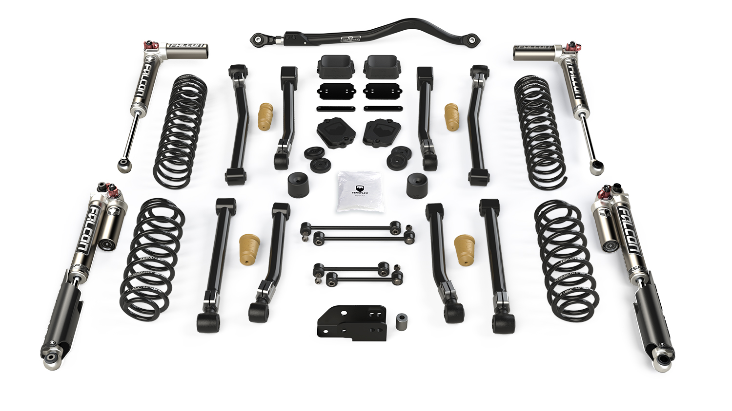 Does not include shocks. We recommend Falcon SP2 Mode Adjust Performance Shocks. Falcon shock absorbers and TeraFlex lift coil springs have been engineered together to improve both compression and rebound for optimal vehicle stability. The Alpine CT2 Suspension System is offered with a choice Falcon SP2 3.3 Fast Adjust Piggyback Shocks, Falcon SP2 3.1 Piggyback Shocks, Falcon SP2 2.1 Monotube Shocks, or without shock absorbers.