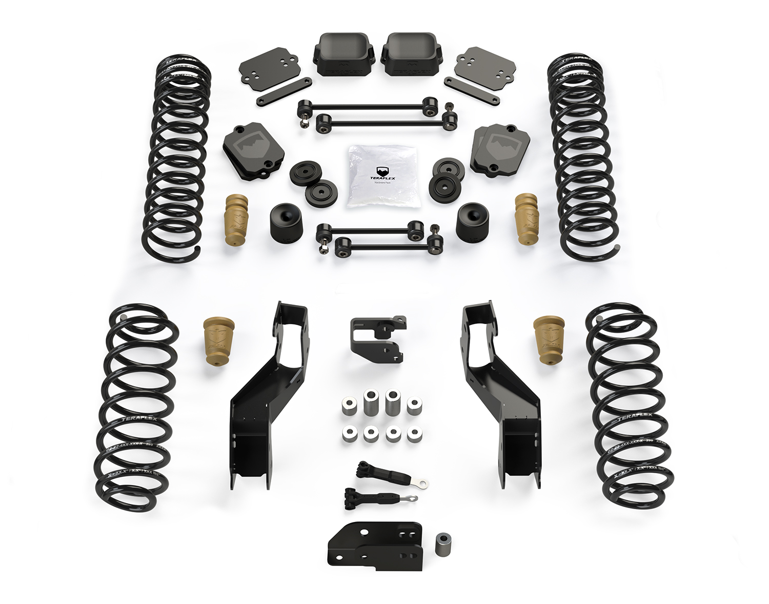 This results in a simple install and drive bolt-on installation with no cutting, welding, or alignment required. These maintenance-free suspension systems provide superior on-road ride quality and comfort with maximum off-road flex. TeraFlex suspension systems provide reduced noise, vibration, and harshness (NVH).