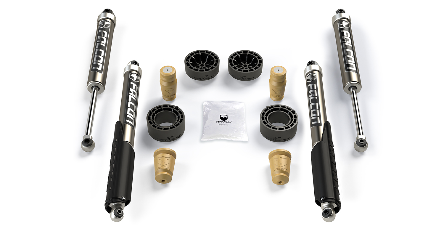 We recommend Falcon Performance Shocks. Falcon shock absorbers and TeraFlex coil springs have been engineered to work together to improve both compression and rebound for optimal vehicle stability. Sport ST Suspension Systems are offered without shocks or with a choice of select Falcon shock absorbers.