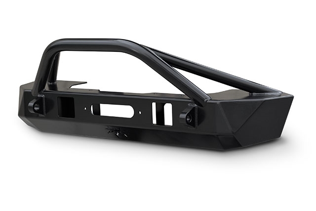 The JL Bruizer front bumper for JL is a grille-width, high clearance bumper with recessed winch mounting. This bumper is fabricated from 3/16 inch plate steel, CNC laser-cut and precision brake-formed into a low profile, high clearance design for optimum off-road performance. The ends of the bumper extend far enough to protect the lower corner of the JL grille, but not far enough to hinder tire clearance or tire access to vertical obstacles. This product is finished in black with Poison Spyder's proprietary SpyderShell Armor Coat process.