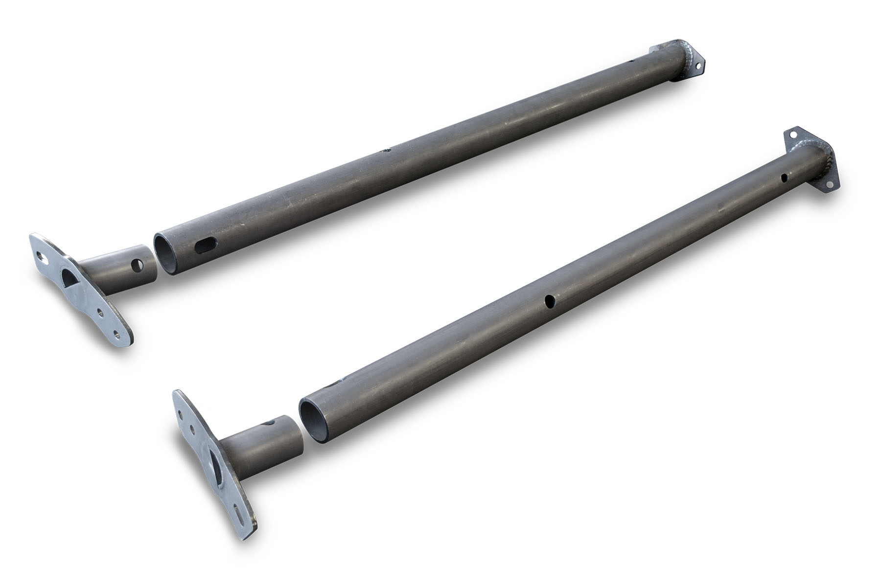 The Heavy Duty Header Bars are made from high strength 1-3/4 inch x .120 wall DOM structural tubing, laser notched and expertly welded to CNC laser cut 3/16 inch mount plates. For comparison, the stock header bars are made of .095 wall welded seam tubing, with thin gauge stamped metal mounting flanges.