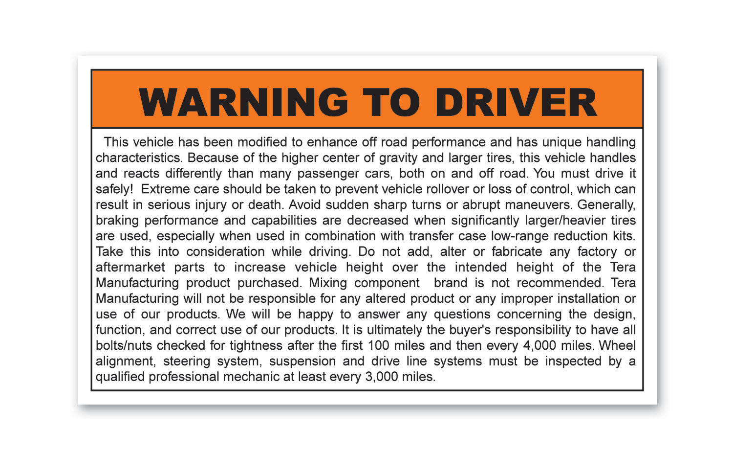 **Discontinued**Warning to Driver Sticker TeraFlex Brand:
